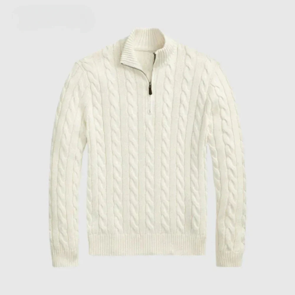 Ein Grobstrick-Pullover mit Reißverschluss, der Wärme, Struktur und Alltagstauglichkeit perfekt balanciert. Der markante Zopfstrick fühlt sich premium an, der Half‑Zip-Kragen lässt sich flexibel an Wetter und Styling anpassen.